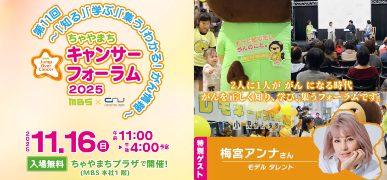 MBS毎日放送とNPO法人キャンサーネットジャパン共催「ちゃやまちキャンサーフォーラム2025」が大阪梅田茶屋町にあるMBS本社1階で開催されます。
