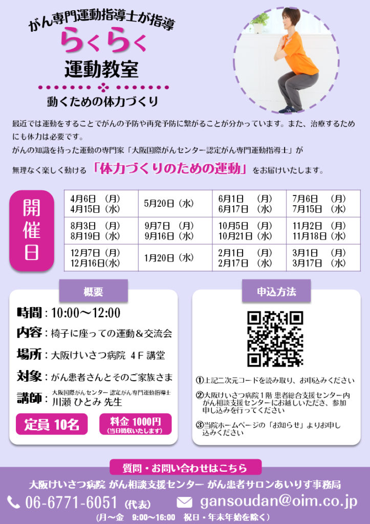 現在、大阪けいさつ病院では、そんな不安に寄り添い、がんサバイバーの皆様が治療前・治療中・治療後を健やかに過ごせるように、また治療を円滑に進めるための体づくりをサポートする「らくらく運動教室」を開催しています。